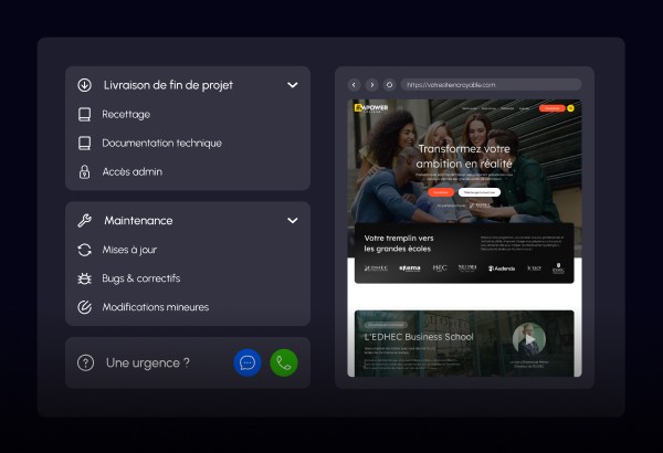 Recettage complet, corrections des derniers détails, mise en ligne sécurisée. On reste disponible le premier mois pour tout ajustement, et au-delà si besoin.